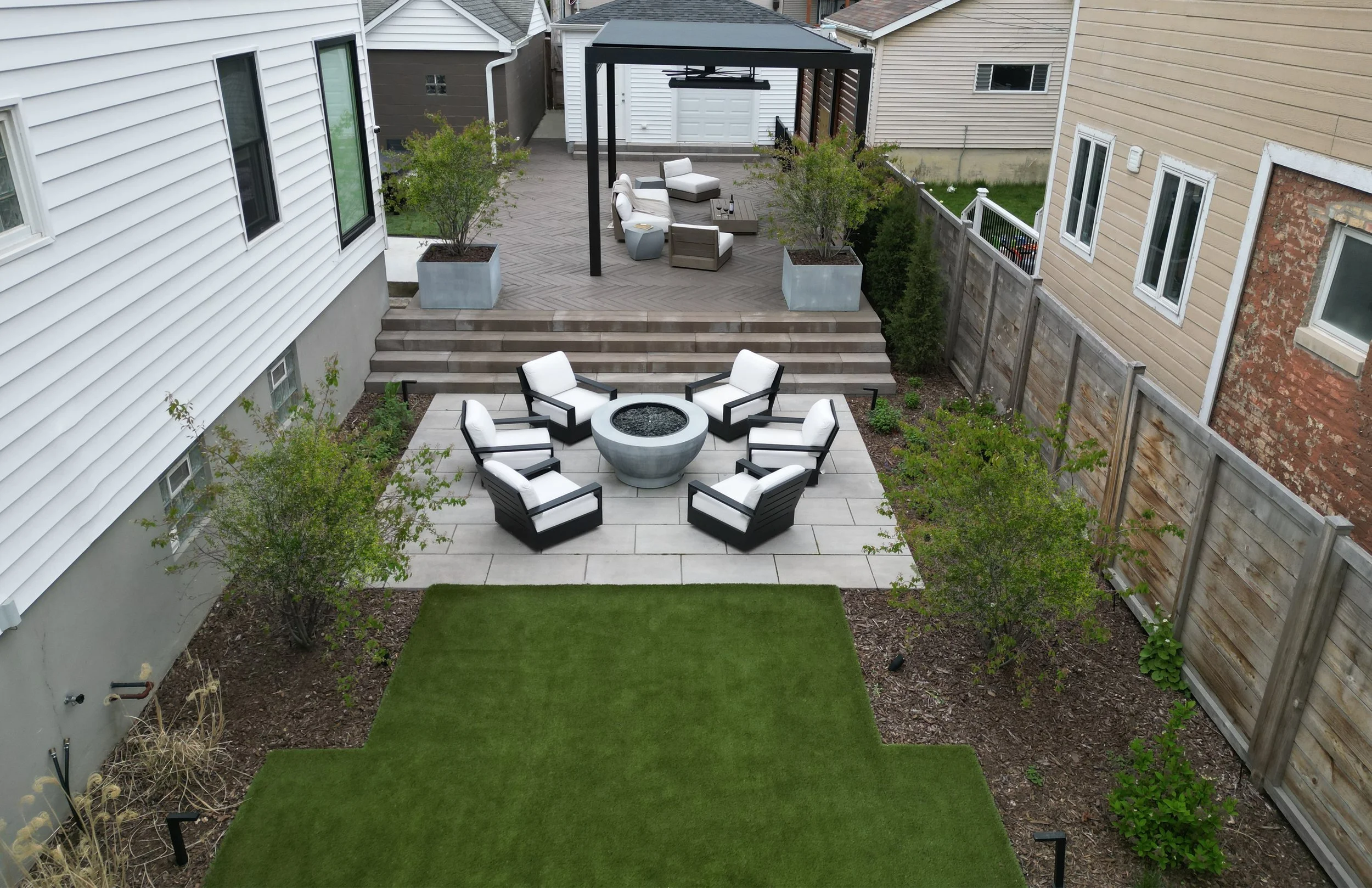 Our client’s growing family needed more (outdoor) space, so they bought the house next door, knocked it down, and hired HDS to design and build an outdoor hideaway, suitable for play, relaxing, dining, grilling, and entertaining. This custom space embraced two levels of patio and yard space, a custom louvered aluminum pergola complete with heater, lights, and fans, an outdoor fire pit, synthetic turf lawn for the pups and kids to play on, custom lighting system, and irrigation to keep everything watered.
